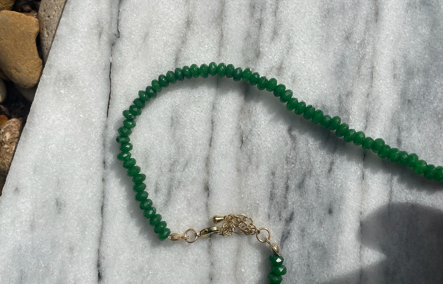 The Emerald Rock Necklace is handmade with emerald green jade faceted beads and a 14kt gold filled clasp. This necklace measures 15" with a 2.5" extender clasp.